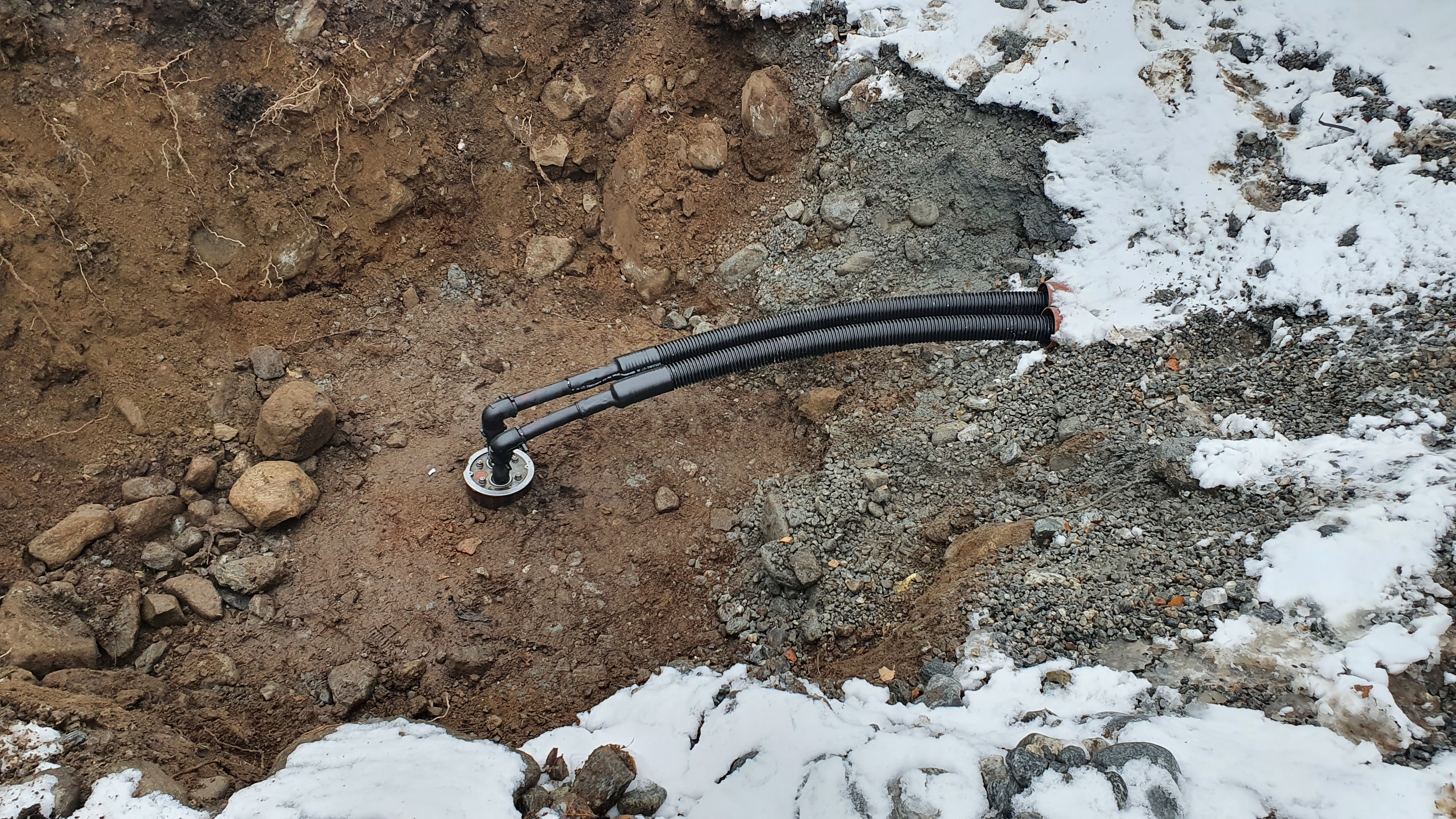 Etter at boring er fullført setter vi ned kollektor i hullet og vi kan sveise sammen slangen i hullet med slangene som kommer fra varmepumpen.